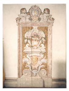 - NOTIZIE STORICO CRITICHE Bellissima anta di armadio realizzata in legno come la decorazione posta nella parte superiore, quasi a fornire l'illusione che si tratti di un decoro ad affresco. Su un fondo in ocra con leggera decorazione a racemi e fiori sui toni del marrone, si dispiega una illusionistica struttura architettonica caratterizzata da un basamento con evidenti volute a ricciolo e da una vaso centrale che contiene un mazzo di fiori policromo. Gli stessi fiori sono ripresi nella parte superiore, diposti in mazzi più composti e meno esuberanti. Al centro una sorta di medaglione con piccola faccina maschile di profilo e coronata d'alloro. Completa la dcorazione il finto marmo della cornice lignea dell'anta. Si ritiene che questo nuovo intervento decorativo sia stato promosso da Giuseppe II Della Porta, da un lato per porre riparo ai disastri dell'alluvisone del 1755, dall'altro per la volontà di rinnovare la villa alla luce delle novità milanesi.