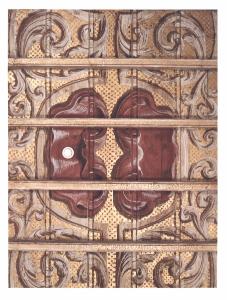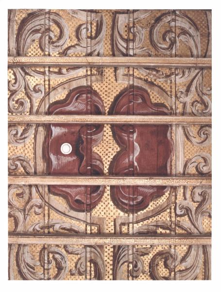 Soffitto ligneo a passasotto. Sfondo a scacchiera.