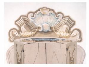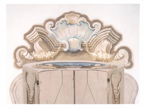 • NOTIZIE STORICO CRITICHE La cornice affrescata è posta sopra la porta verso l'alcova. Si caratterizza per il consueto motivo a conchiglia, piuttosto accentuata, posto centralemnte, di lato deu mensole con vlute a ricciolo inquadrano la stessa, mentre nella parte inferiore sono posti due festoni con foglie.