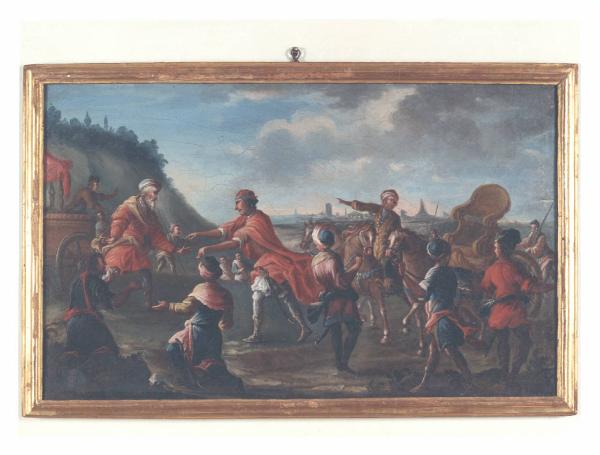 - NOTIZIE STORICO CRITICHE L'iconografia del dipinto è di difficile identificazione, sembrerebbe l'incontro tra un re, probabilmente orientaleggiante per il copricapo e la spada ricurva, e un uomo più anziano, ma di rango inferiore. Attorno si dispongono altr figure maschili, variamente atteggiate. Si propede per una datazione seicentesca sia per alcune posture maschili sia per la connotazione cupa e gli intensi bagliori che illuminano le vesti. Si ignora l'autore.
