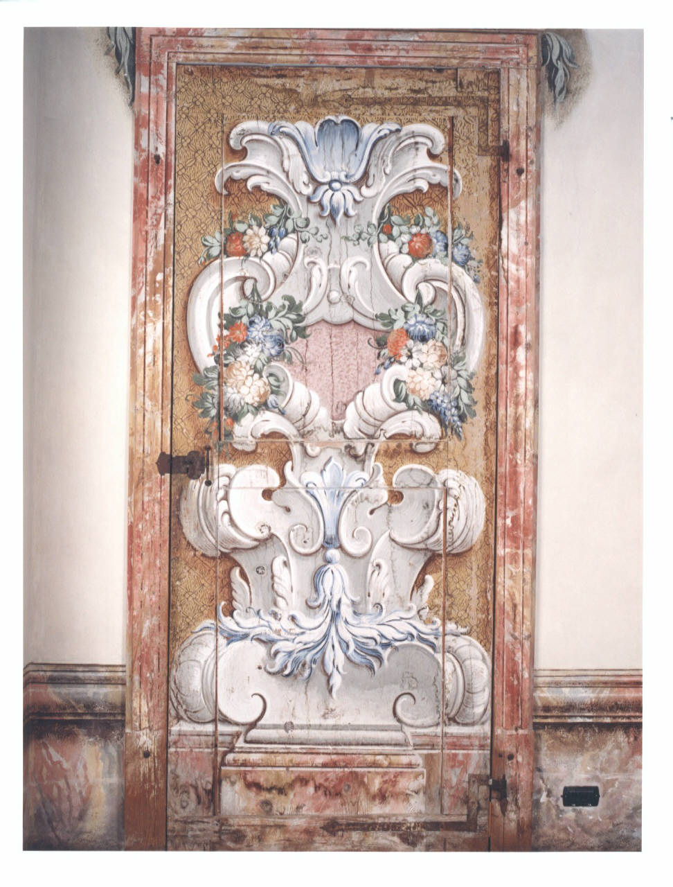 - NOTIZIE STORICO CRITICHE La porta è decorata sia sul recto che sul verso. Nella parte del recto compare, su un fondo giallo variegato da una sottile decorazione a tondi sul marrone, il consueto elemento architettonico costituito da un basamento con volute, in questo caso piuttosto accentuate, e dai classici mazzi di fiori policromi che alleggeriscono la struttura. In alto coronamento a conchiglia nei toni dell'azzurro. Il verso, mostra la stessa tipologia, ma trattata a monocromo e terminante con un vaso da cui fuoriescono dei frutti. Il fondo è diverso nel decoro, qui con sottili racemi, pallini e reticoli. Si ritiene possa essere attribuita alla equipe del Romagnoli, attivo nella decorazione del fregio soprastante.