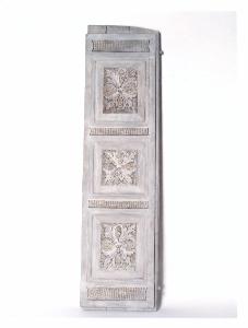 - NOTIZIE STORICO CRITICHE Gli scuri della finestra si presentano dipinti a tempera grigia; suddivisi in tre riquadri da strisce orizzontali, questi sono decorati da elementi fogliacei disposti come se fossero fiori, con sottili rialzi in bianco e ombre più scure in grigio. Il fondo, così come le strutture orizzontali, sono decorati con piccoli puntini nei toni del marrone.