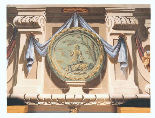 - NOTIZIE STORICO CRITICHE La camera del letto rosso si caratterizza per un fregio che corre per tutte e quattro le pareti. Si compone di quadrature con medaglioni, scorci di paesaggio ed elaborate acquerecce (recipienti metallici ad un manico) barocche ad anse anguiformi e messe uteriormente in evidenza dall'intenso colore giallo. Il medaglione centrale qui dipinto, si compone di una corona di foglie d'alloro che racchiude un paesaggio ed una figura femminile seduta e vista di tergo, il tutto giocato sui toni del verde con rialzi in giallo. Lateralmente, l'illusionistica balaustra permette di scorgere le chiome degli alberi. A causa delle gravi infiltrazioni d'acqua, questi decori vennerro ritoccati tra la fine dell'Ottocento e gli inizi del secolo successivo.