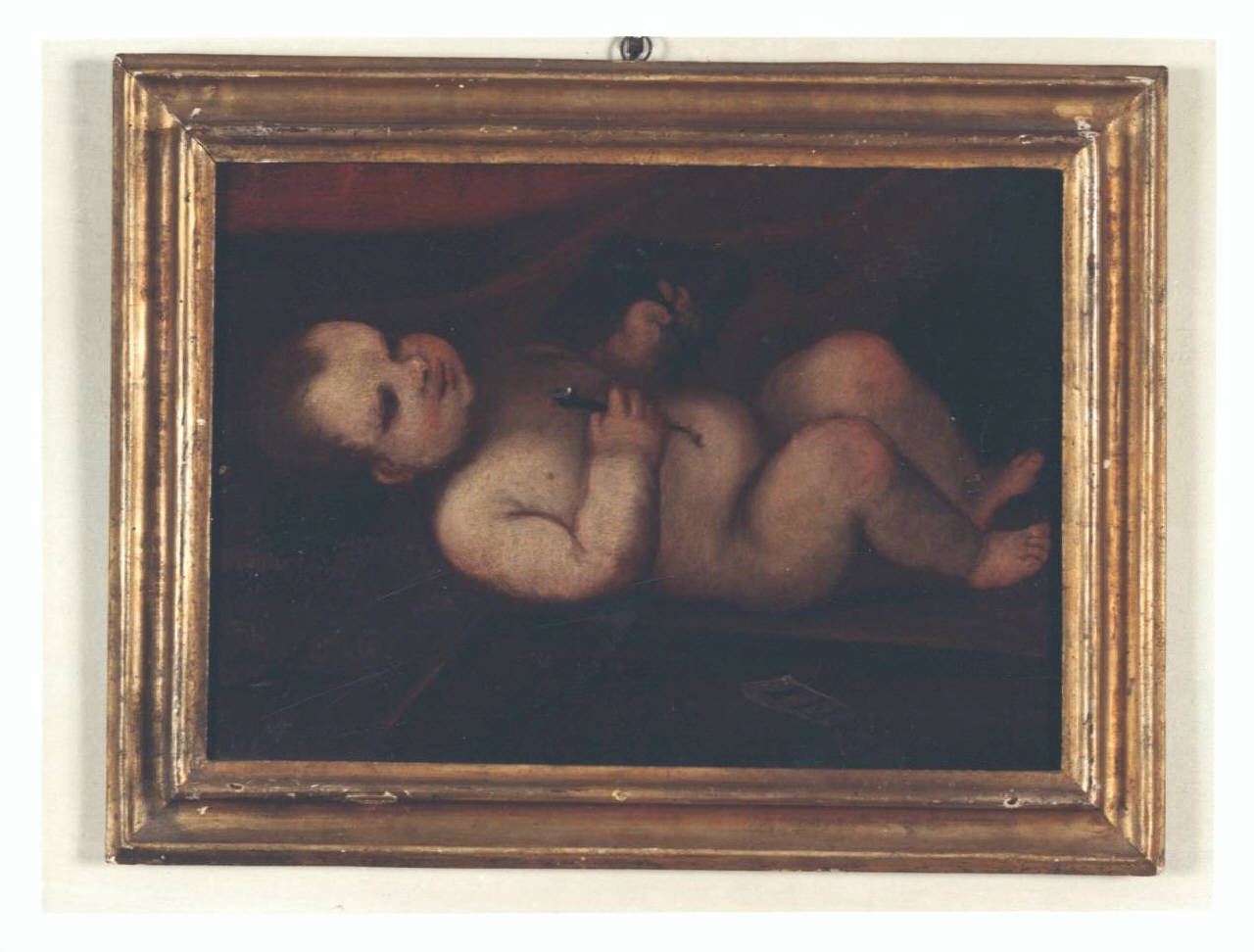 - NOTIZIE STORICO CRITICHE Piccolo dipinto raffigurante Gesù Bambino dormiente sulla croce e con in mano i chiodi, simboli del futuro martirio, così come il drappo rosso visibile sullo sfondo. Appenna accennato il cartiglio con la scitta INRI.