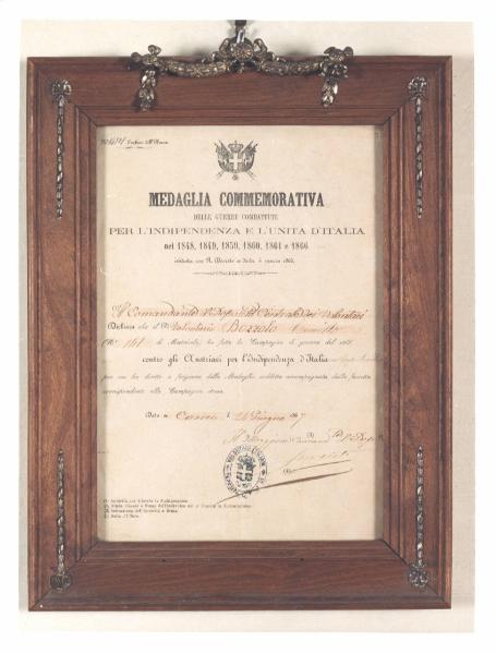 - NOTIZIE STORICO CRITICHE L'opera in oggetto attesta la consegna della medaglia a Camillo Bozzolo per avere prestato servizio volontario durante le guerre d'indipendenza dell'Italia dall'Austria.