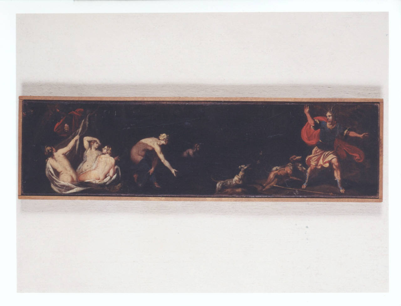 - NOTIZIE STORICO CRITICHE Questo piccolo dipinto, che probabilmente doveva costituire la predella in un'opera di maggiori dimensioni, presenta il mito di Diana e Atteone, quest'ultimo punito dalla Dea per averla sorpresa nuda al bagno. Trasformato in cervo venne sbranato dai suoi stessi cani. Sul fondo cupo spicca la candida nudità sia del gruppo delle ninfe, posto all'estrema sinistra, dall'atteggiamento sensuale sottolineato dai tessuti vaporosi nei toni del bianco e del grigio, sia di Diana, chinata su se stessa mentre aizza i cani contro Atteone. Questi è raffigurato mentre scappa, le corna del cervo già spuntate sul capo, le braccia aperte in un gesto di sorpresa, amplificato dall'andamento del panneggio rosso. In basso i cani, dei levrieri dall'elegante collare, fiutano la preda.