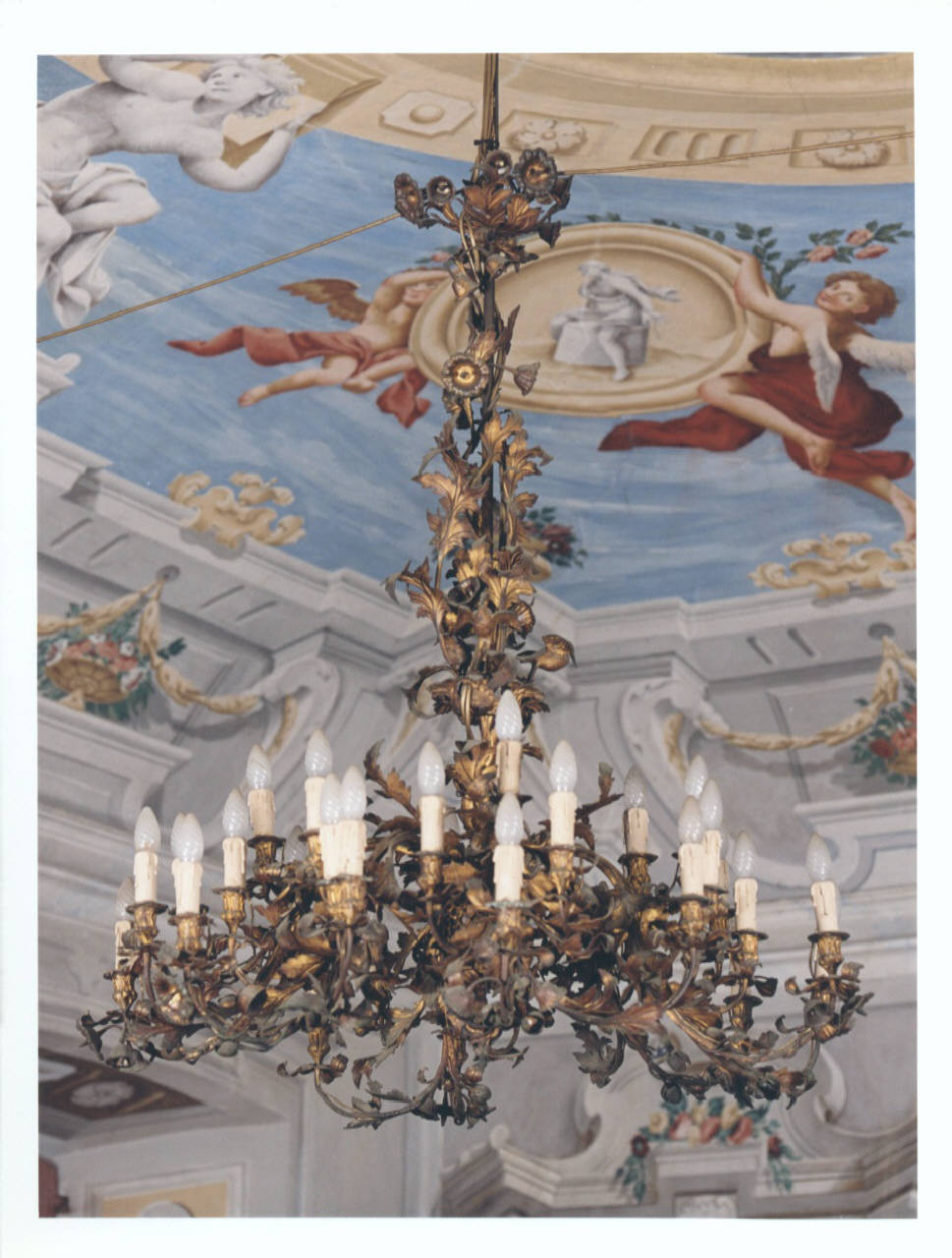 Il lampadario risulta particolarmente eleborato, formato da un cestino traforato centrale da cui si dipartono rami fogliati e campanule, quest'ultime spesso con la corolla rivolta verso il basso. Vi sono in totale, ventiquattro portalampade. Il motivo delle foglie che avvolgono le delicate campanule si sviluppa anche verticalmente, conferendo al lampadario ulteriore ricchezza. L'insieme è particolarmente raffinato, fornendo una sensazione di leggerezza e preziosità.