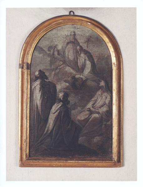 - NOTIZIE STORICO CRITICHE Piccolo dipinto a grisaille, quindi con l'uso di un colore monocromo. Raffigura dei monaci bendettini in primo piano, di cui quello centrale sta indicando con la mano destra l'evento che si sta svolgendo nella zona superiore, cioè la Gloria di San bendetto. Lo stesso monaco, voltato verso lo spettatore, è il tramite tra lo spazio reale e quello dipinto. Sul retro della tela è stata posta una nota manoscritta che indicherebbe in un certo Venini S. l'autore dell'opera: attualemnte, però, risulta sconosciuto ai repertori.