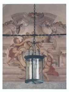 Lampadario a lanterna, collocato nella corte d'onore. Molto semplice, ha una catena in ferro battuto a maglie ovali che termina, nella parte inferiore, in quattro riccioli che sostengono il paralume di vetro.