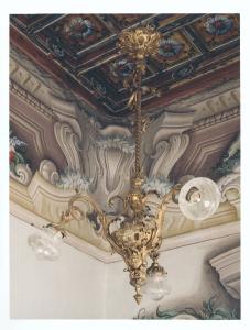 Il lampadario è costituito da un'asta centrale, a torciglione, che si raccorda superiormente a dei motivi a ricciolo con trafori, inferiormente ad un motivo decorativo a grata arricchito da foglie d'acanto. Da questo partono, come fossero gambi di fiori attorcigliati su se stessi, tre elementi che terminano con un paralume in vetro decorato, probabilmente degli inizi del Novecento.