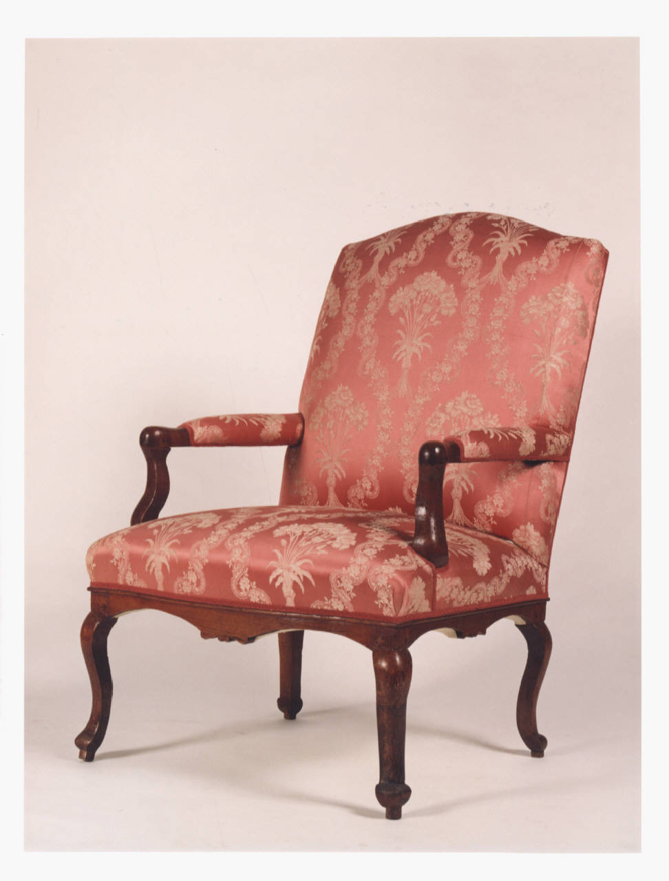 Schienale rettangolare con finale sagomato, braccioli a vista imbottiti, gambe mosse, rivestito con tessuto in seta rosa