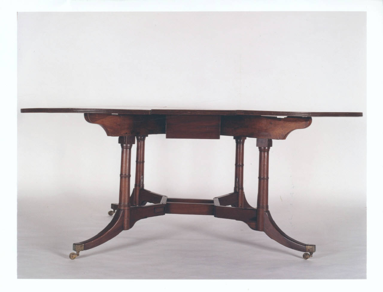 Tavolo a rotelle con ali laterali pieghevoli, quattro sostegni a sezione rotonda scanalati orizzontalmente e uniti da traversa liscia quadripartita, fronte a un casseto