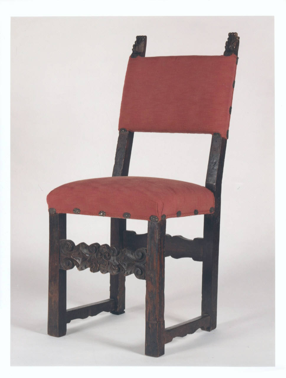 Schienale rettangolare, finali a fiamme intagliate, sostegni a sezione quadrata, traverse laterali basse leggermente sagomate, traverse centrali alte, quella anteriore intagliata rusticamente, tessuto operato dello schienale e della seduta fissato con borchie in bronzo a forma di fiore