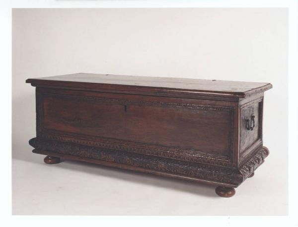 Cassone con cornici modanate e intagliate, piedi a cipolla, due prese a ferro di cavallo laterali