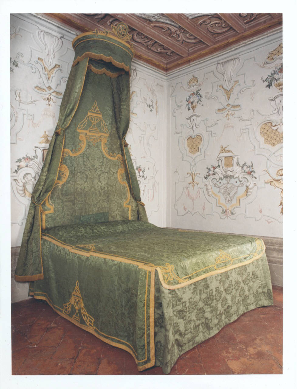- NOTIZIE STORICO CRITICHE Dell'originario letto settecentesco è sopravvisuto solo il baldacchino ovale, frammento completato con gli elementi mancanti in stile - copriletto, testata e cortine laterali - realizzati utlizzando una seta simile a quella del modello originale. Il letto fa parte dell'originario arredo della casa come è testimoniato da una foto storica degli inizi del XX secolo.
