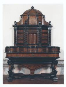 - NOTIZIE STORICO CRITICHE Gli scrittoi con alzata in radica di noce databili alla seconda metà del XVII secolo, data la grandiosità e l'elaboratezza dell'intaglio, sono da considerarsi dei mobili da pompa, più consoni ad una funzione espositiva che oggetti di uso quotidiano. L'intarsio del piano e dei sostegni è copiati dai coevi modelli olandesi.