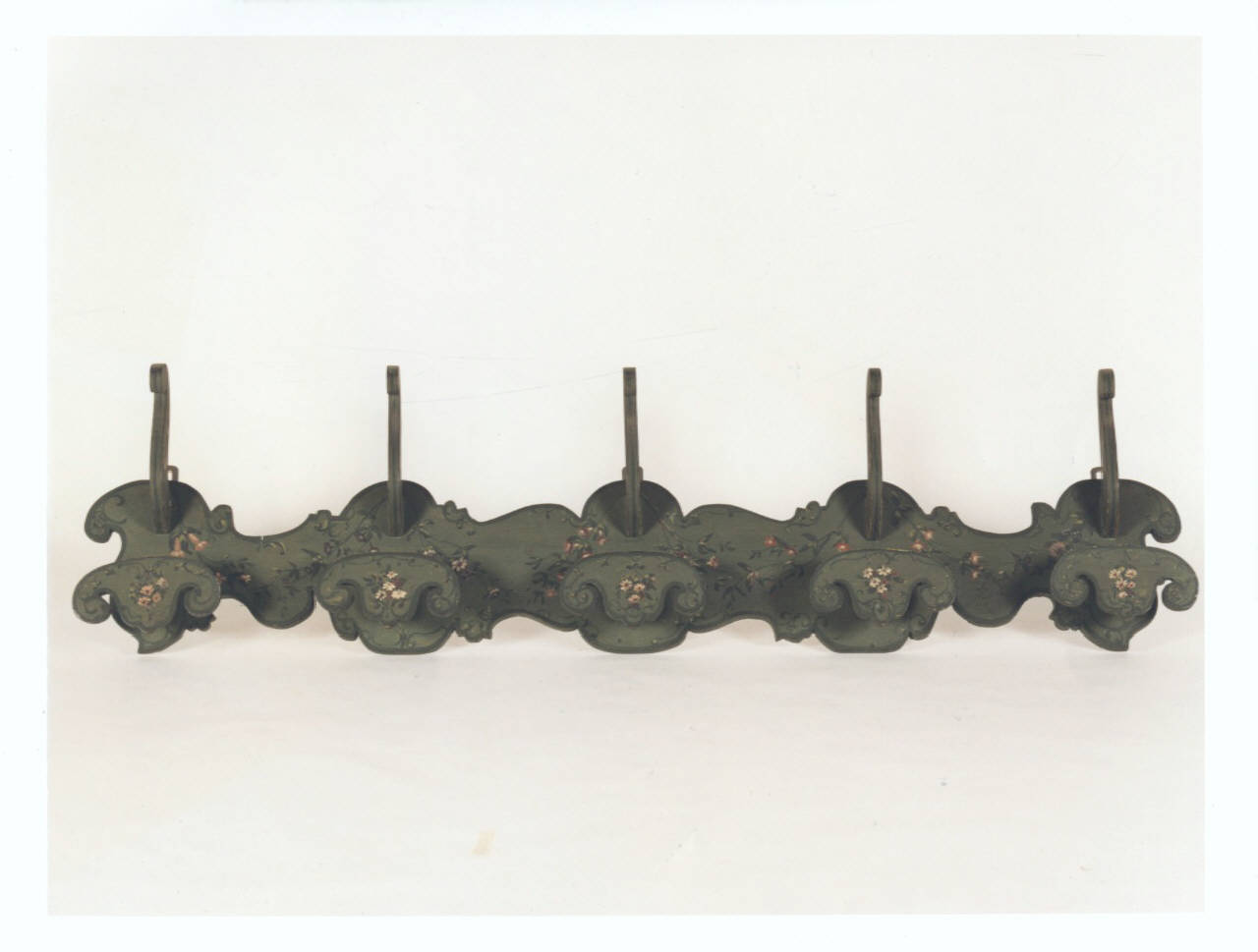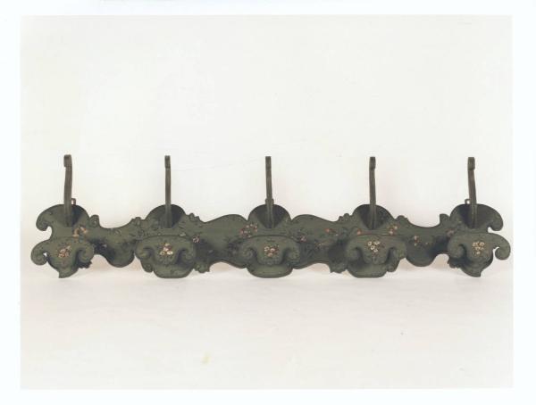 Attaccapanni da parete sagomato a cinque prese anch'esse sagomate, dipinto in verde con decorazioni floreali policrome nei toni del rosa, azzurro e verde