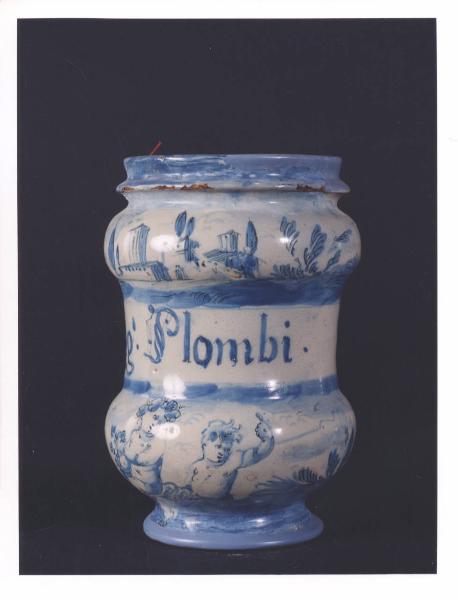 - NOTIZIE STORICO CRITICHE Vaso da farmacia proveniente dalla farmacia Barberis, attiva in Bistagno (Alessandria) dalla prima metà del XIX secolo. Sotto la base dell'alberello è dipinto in monocromia turchina su fondo bianco un marchio a forma di fortezza stilizzata. L'impiego della marca Fortezza è documentato presso fornaci savonesi ma non ne si conosce la bottega di appartenenza perchè parte dei contrassegni di produzione ligure sconosciuti. La tipologia decorativa comunemente chiamata a "scenografia barocca" si diffonde a partire dalla metà del XVII secolo, periodo in cui sui vasi di manifattura ligure si cominciano a riprodurre non solo elementi vegetali e animali, ma anche figure (putti, personaggi storici, mitoligici, biblici...) incornciate entro sfondi paessaggistici con cieli solcati da nuvole in cui compaiono anche elementi architettonici (ville, castelli...).
