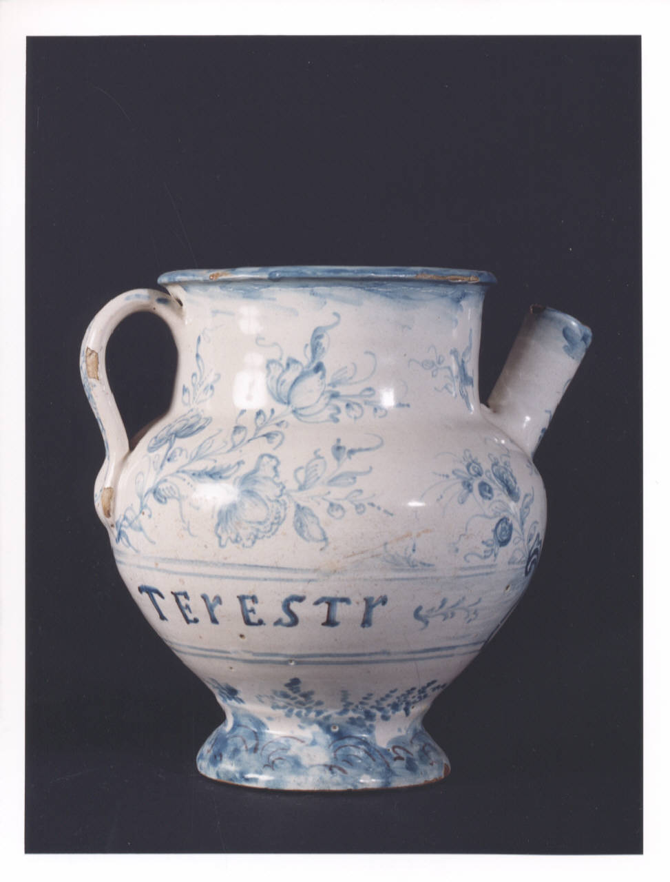 - NOTIZIE STORICO CRITICHE Vaso da farmacia proveniente dalla farmacia Barberis, attiva in Bistagno (Alessandria) dalla prima metà del XIX secolo. L'iscrizione testimonia l'originario contenuto del boccale: un olio. Il marchio sotto la base del vaso riporta le iniziali G. B. Secondo Raffaella Ausenda, potrebbero riferirsi a Giacomo Boselli, celebre ceramista savonese del XVIII secolo. L'analisi del marchio però fa pensare a una diversa ipotesi attributiva: il Boselli firmava ufficialmente per esteso le sue ceramiche. Le iniziali G. B. potrebbero essere di un certo G. Berti appartenente alla famiglia Berti, operante a Savona nel XVIII secolo.