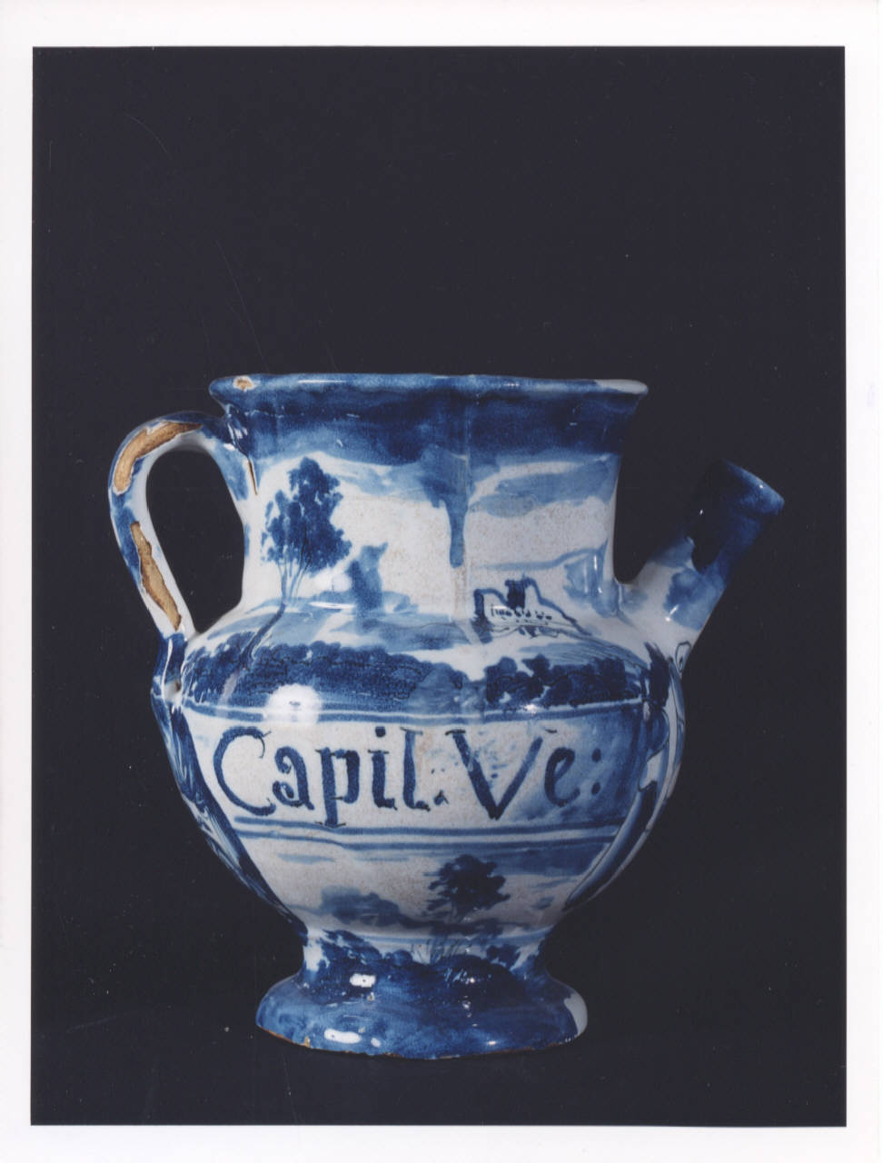 - NOTIZIE STORICO CRITICHE Vaso da farmacia proveniente dalla farmacia Barberis, attiva in Bistagno (Alessandria) dalla prima metà del XIX secolo. L'iscrizione testimonia l'originario contenuto del boccale: uno sciroppo a base di "capelli di Venere". Sotto la base del boccale è dipinto in monocromia turchina su fondo bianco un marchio a forma di lanterna stilizzata, raffigurazione del faro di Genova. La marca Lanterna fu concessa dal Senato di Genova nel 1641 come privilegio alla famiglia dei Grosso di Albissola ma verso la fine del XVII secolo divenne contrassegno della famiglia dei Chiodo di Savona, rilevatari della fabbrica, i quali già utilizzavano un contrassegno simile: una tromba munita di vessillo trasformatasi poi in lanterna. La tipologia decorativa a "scenografia barocca" si diffonde a partire dalla metà del XVII secolo, periodo in cui sui vasi di manifattura ligure si cominciano a riprodurre non solo elementi vegetali e animali, ma anche figure (putti, personaggi storici, mitoligici, biblici...) incornciate entro sfondi paesaggistici con cieli solcati da nuvole in cui compaiono anche elementi architettonici (ville, castelli...).