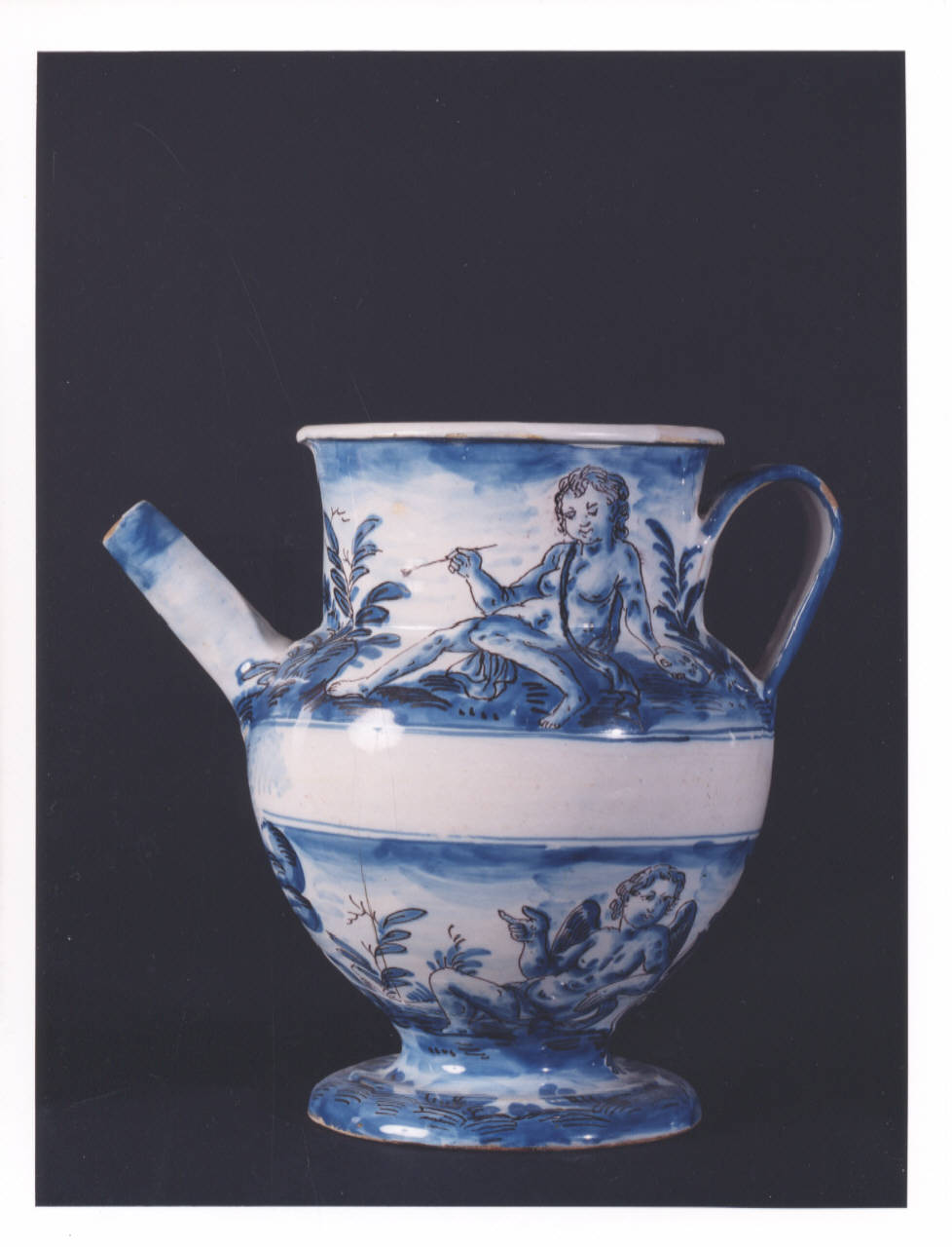 Vaso con corpo ovoidale su piede espanso, collo cilindrico terminante con bocca ad orlo estroflesso, ansa piatta, versatoio a cannello cilindrico. Decorazione in monocromia turchina su fondo azzurrato del tipo a "scenografia barocca" con quattro putti entro paesaggio: uno regge una cesta colma di frutti, un'altro è rappresentato mentre dipinge e i due rimanenti oziano sui prati. Sotto il versatoio è raffigurato un serpente mentre sotto l'ansa è raffigurato uno stemma a forma di scudo coronato con all'interno due braccia che si incrociano sormontate da una croce. Nella zona mediana la decorazione è interrotta da un cartiglio delimitato da filettatura privo di iscrizione