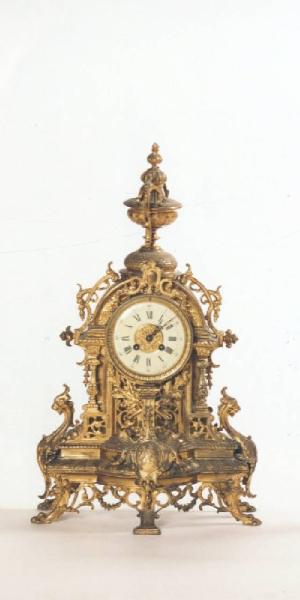 Orologio da camino con quadrante circolare in smalto bianco con numeri arabi incorniciato da due colonne reggenti un architrave semicircolare; base polilobata con due estremità a guisa di animale fantastico, piedi a zampa di leone; volute, riccioli, girali vegetali e tralci di foglie decorano la superficie e i profili; pinnacolo superiore con finale a vaso