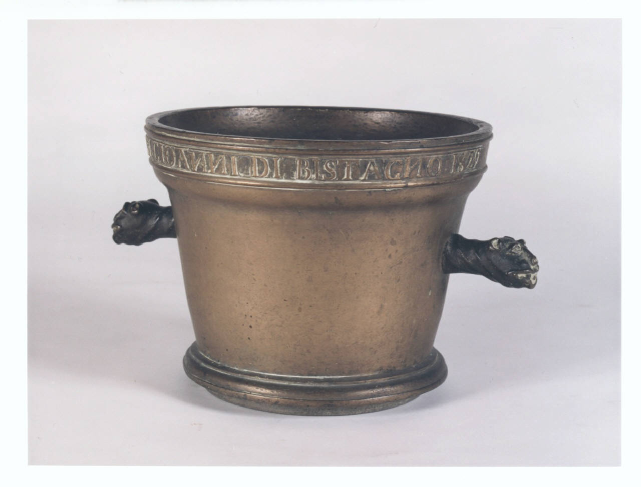 Mortaio di forma cilindrica svasata con base circolare, prese a forma di testa di animale fantastico; bordo superiore inciso con nome