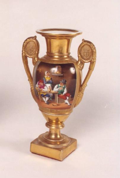 Vaso ad anfora a due anse lavorate terminanti con un medaglione in cui è racchiusa una testa femminile, alto collo cilindrico terminate ad orlo estroflesso, piede circolare poggiante su base quadrata