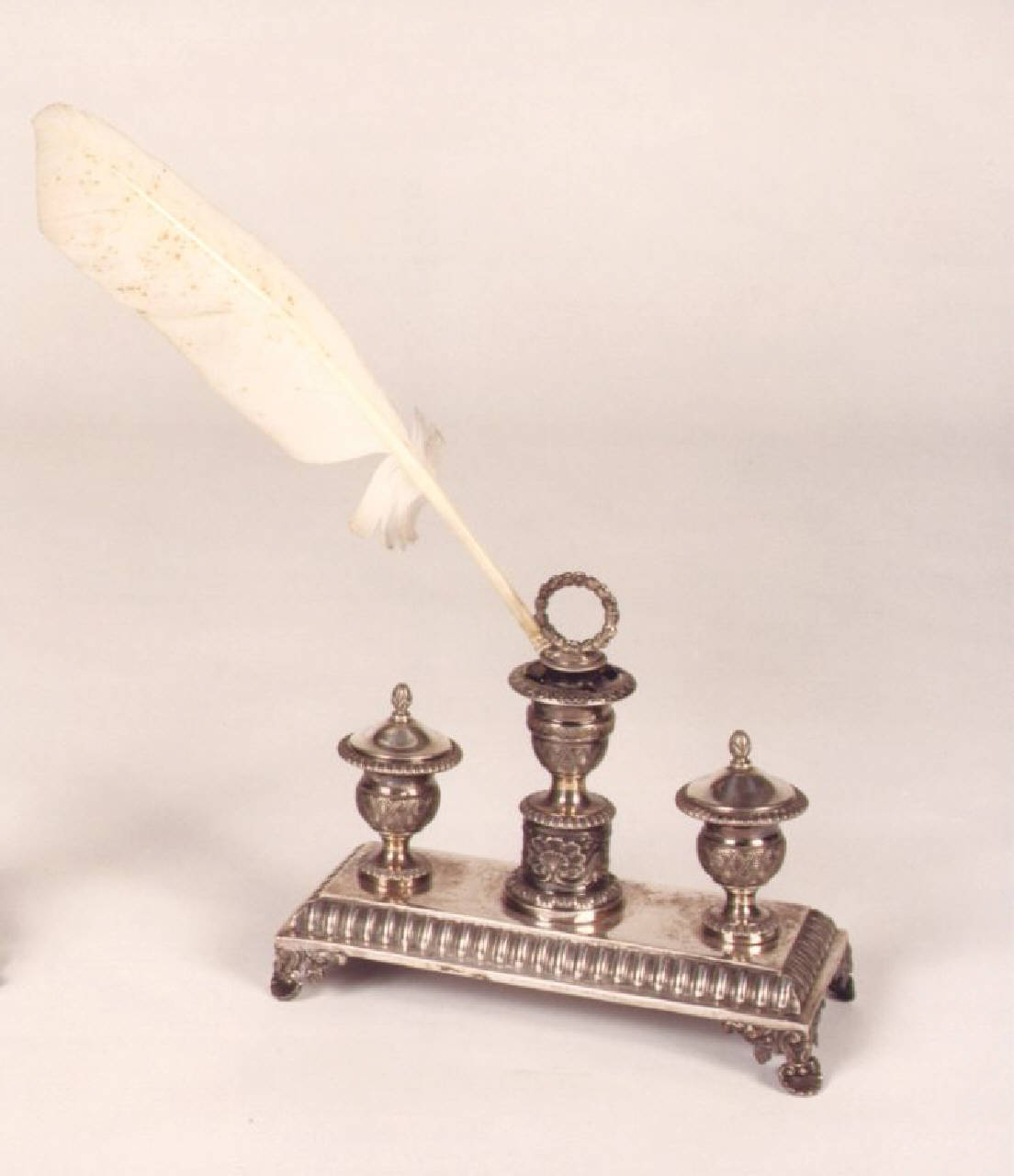 Base rettangolare, profili sbalzati a bacellature, quattro sostegni fitomorfi terminanti a conchiglia; due contenitori laterali a forma di vaso decorati a motivi a losanghe poggianti su basi circolari profilate a bacellatura, coperchi con finale a ghianda; contenitore centrale a forma di vaso decorato a motivi a losanghe poggiante su base cilindrica percorsa da motivi a rocaille, coperchio con fori per le penne sormontato da un finale a corona di foglie