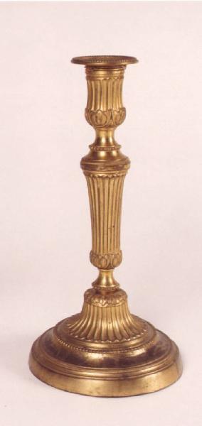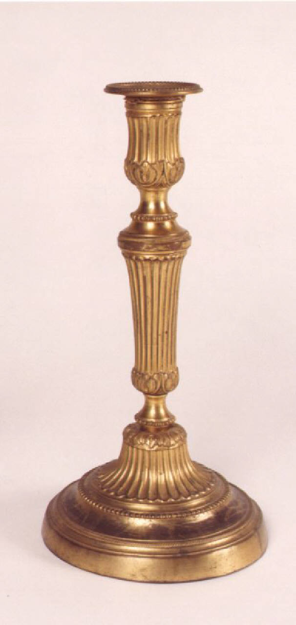 Fusto di linea rastremata verso il basso con scanalature verticali e decorazioni a foglioline, base circolare gradinata, reggicero a vaso con bacellature verticali e decorazioni a foglioline; profili a cordoncino e perlinati
