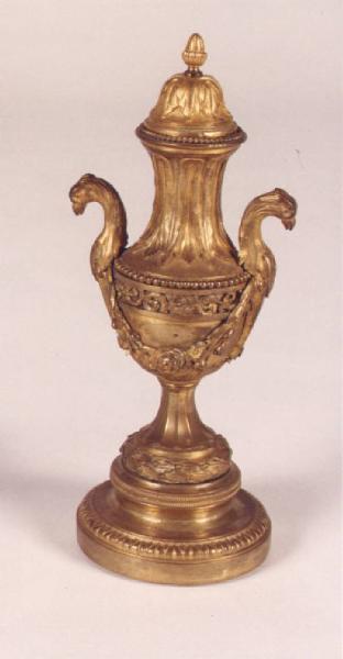 Fusto a vaso a due prese a guisa di rapace dalle quali si diparte una ghirlanda di fiori, coperchio profilato da bordo a cordoncino e finale a pigna; base circolare gradinata con profili a foglioline, a cordoncino e a ghirlanda di foglie e bacche