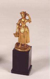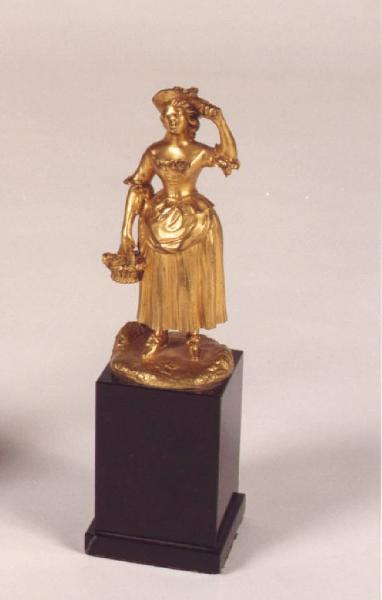 Scultura raffigurante una contadina; base in marmo nero con struttura verticale a parallalepipedo