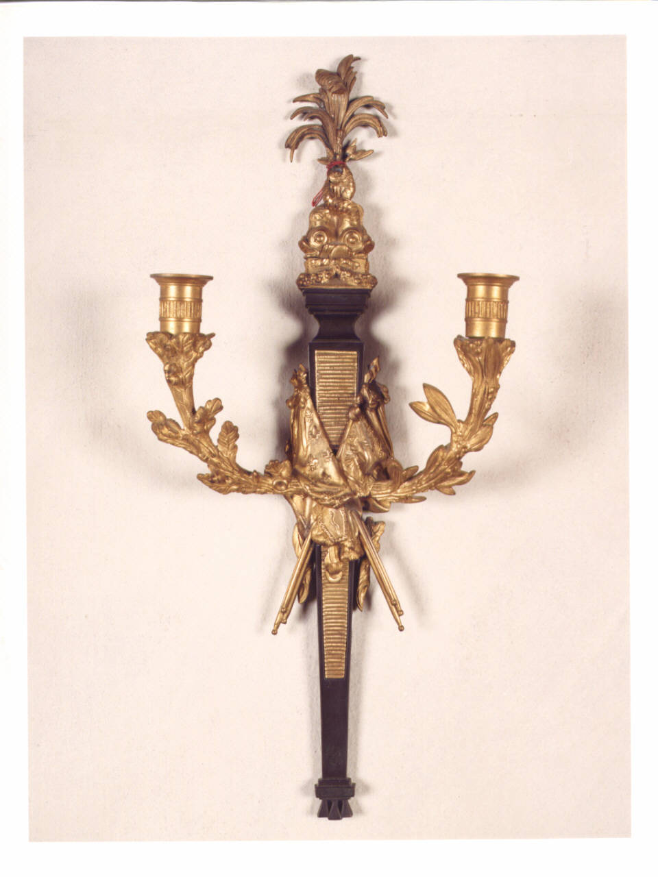 Lampada a muro a due bracci sagomati a guisa di tralcio vegetale con reggicero cilindrico con collo estroflesso; fusto di linea rastremata con placca a scanalature orizzontali centrato da stendardi incrcociati e sormontato da capitello che funge da base a una composizione vegetale e floreale terminate a pinnacolo di foglie