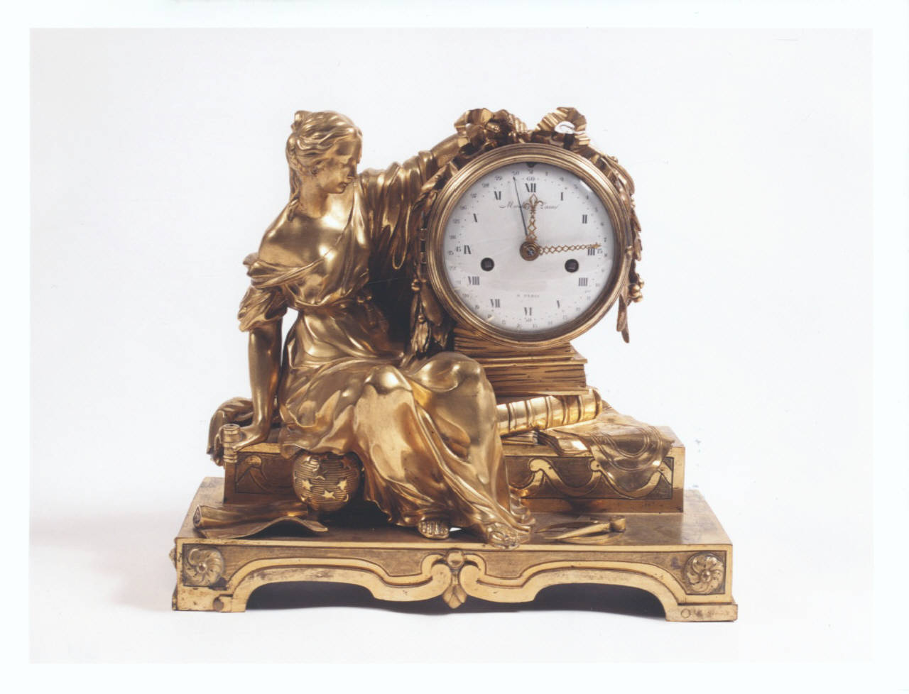 - NOTIZIE STORICO CRITICHE Claude (o Charles) Mathieu L'Ainè, autore della meccanica dell'orologio, \nfu attivo a Parigi tra 1754 e 1789. L'oggetto è il tipico esemplare di pe\nndola Luigi XVI, come testimoniano i motivi decorativi: ghirlande, nodo d'amore, greca di volute. Anche il soggetto è tipico di questo periodo: son\no noti diversi esemplari raffiguranti le sette arti liberali, in particolare l'Astronomia, raffigurata con i suoi attributi (globo, strumenti scientifici e libri). Al Victoria and Albert Museum si conserva un esemplare con lo stesso soggetto ma con iconografia leggermente diversa (differente posizione degli attributi, colonna al posto dei libri) e con basamento in marmo; da segnalare anche una pendola firmata Henry Vosin, interamente in bronzo dorato, con la medesima iconografia. L'oggetto proviene dalla collezione pavese di Gianfranco e Mirella Tartara e fu donato al FAI nel 2003; grazie all'inventario notarile di Gianfranco Tartara, sappiamo che l'orologio era appartenuto precedentemente a una collezione privata torinese (Rossi).