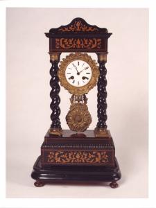 Base a parallalepipedo decorata con motivi floreali e volute su cui poggiano quattro colonne tortili che reggono un timpano con cimasa sagomata; tra le colonne è posto il quadrante incorniciato da una corona di foglie, fiori e motivi rocaille. Quadrante in smalto bianco con numeri arabi in nero ad indicare le ore