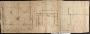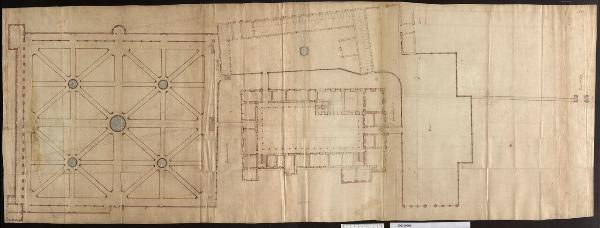 disegno in scala, conserva tracce della preliminare costruzione a grafite; è eseguito a inchiostro bruno a penna, principalmente con tiralinee e compasso, con tratteggi a mano libera ad inchiostro su tracce a matita; le murature di progetto sono acquerellate color rosso bruno, le specchiature d'acqua in azzurro; il disegno è tracciato su carta chiara imbrunita e il supporto è di tre fogli incollati