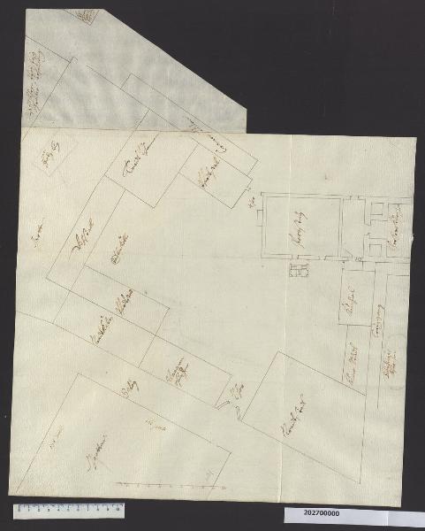 - NOTIZIE STORICO CRITICHE Nella "Spiegazione de Numeri" del tomo nel quale era rilegato, il disegno viene definito: "Altra come sopra". L'identificazione di questo disegno è incerta, sia per quanto riguarda l'autore che la datazione. Le uniche notizie rilevabili riguardano la localizzazione dell'edificio (o serie di edifici ?) rappresentato nella Piazza Grande della città di Altötting, da un confronto con una planimetria della stessa conservata presso la Biblioteca Statale di Lucca (Biblioteca Statale di Lucca, ms. 1752 f. 33). Del piano della città e della costruzione di una grande chiesa di pellegrinaggio, si era occupato Henrico Zuccalli nel 1673 e sicuramente Martinelli ne conosceva il progetto, come afferma Hellmut Lorenz (Lorenz 1991, KAT 1, p. 271), in quanto ne aveva preso spunto per la progettazione della chiesa di Austerlitz. Lo stesso Lorenz presume che Martinelli potrebbe essere passato da Altötting intorno all'anno 1700. Il disegno, che riporta diverse iscrizioni forse in antica lingua tedesca all'interno dei fabbricati rappresentati molto schematicamente, ha un'iscrizione sul verso che indica "Disegni di Sua Ecc.za Conte di Caunitz". Nessun documento in nostro possesso, tuttavia, mette in relazione il conte con la città di Altötting. Il disegno è collegato con il dettaglio di uno dei corpi di fabbrica rappresentati, conservato nella presente collezione (Milano, Collezione Sardini Martinelli inv. 2,28).