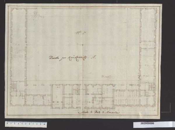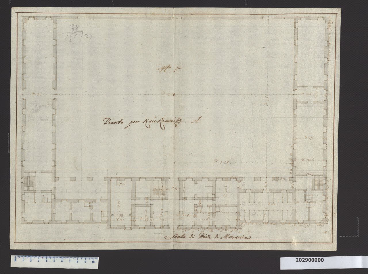 - NOTIZIE STORICO CRITICHE Nella "Spiegazione de numeri" del tomo nel quale era rilegato il disegno viene definito: "Pianta per Neu" Kaunitz". A partire dal 1692, Dominik Andreas Kaunitz aveva incamerato vaste proprietà terriere nella piana di Neutra-Tal, a nord di Neu-häusl (Nové Zàmky) (Ungheria) che, nel 1694, dopo aver ottenuto l'autorizzazione imperiale, chiamò "Neu-Kaunitz". Mentre ad Austerlitz doveva sorgere la grande industria manifatturiera, qui era stata pianificata un'enorme scuderia, un allevamento di cavalli, della cui progettazione, venne incaricato Domenico Martinelli. Il progetto di Neu-Kaunitz data probabilmente a dopo il 1700, anche se i documenti registrano la presenza di muratori e scavatori già nel 1698-99, mentre quella del Martinelli è documentabile a partire dal 1701. La costruzione delle scuderie, che non verranno realizzate secondo il progetto martinelliano, rallenta nel 1703 e si interrompe definitivamente nel 1704. La pianta, assegnata dal Lorenz al Bitterpfeil, raffigura una prima soluzione per il complesso di Neu-Kaunitz, di dimensioni molto ridotte rispetto al progetto poi ideato dal Martinelli. Accanto alla residenza del conte, il cui schema planimetrico sporgente e di impianto simmetrico, prevede una sala centrale con ambienti laterali, tra cui anche una cappella, si dispongono due ali ad L destinate quella di sinistra ad abitazioni e a scuola di equitazione, quella di destra a scuderie. Sul retro un muro di recinzione, aperto in tre punti, mette in comunicazione la corte centrale con la campagna circostante.