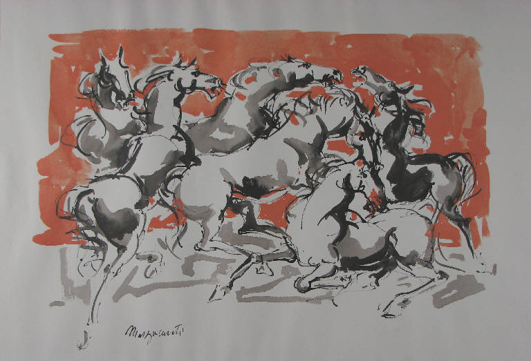 - NOTIZIE STORICO CRITICHE La datazione di questo disegno può essere fatta risalire con ogni probabilità alla seconda metà degli anni sessanta. A questo periodo infatti appartengono alcune chine aventi identico soggetto (1967-'68), molto simili nell'esecuzione (Omaggio Mazzacurati, 1971, tavv. 48, 49, 51).\nIl soggetto, la composizione mossa della scena, nonchè lo stile quasi barocco e l'esecuzione veloce consentita dall'utilizzo della china, avvicinano più in generale questo disegno ai numerosi realizzati nello stesso periodo dall'artista su ispirazione dei grandi pittori romantici francesi Gericault e Delacroix, che ritraggono lotte tra cavalieri e animali feroci (Omaggio Mazzacurati, 1971, tavv. 44, 50, 52, 53).\nDelacroix pittore e autore di scritti d'arte è oggetto, nel 1956, di uno studio critico di Raffaele De Grada, caro amico di Mazzacurati: la pubblicazione di De Grada per l'Universale Economica della Feltrinelli testimonia, come scritto espressamente nel quarto di copertina, il generale movimento di interesse in quegli anni per l'opera dell'artista francese (De Grada, 1956).\nMazzacurati si trova in quella fase della sua carriera in cui si dedica prevalentemente alla scultura, restando il disegno uno sfogo in cui egli esercita più liberamente la sua fantasia e sviluppa l'aspetto sperimentale della sua ricerca.\n"Poi (...) credo che siano stati pochi i monumenti, i quadri, i disegni, gli scherzi pittorici che non mi abbia fatto vedere mentre li costruivi (...)", scrive Lajolo nel 1971 in una lettera al defunto amico "Mazza", riferendosi al periodo successivo al rientro di entrambi da un festival della gioventù a Berlino (fine anni '50 - primi anni '60) che vide il consolidarsi della loro amicizia (Lajolo 1971). \nNumerose sono quindi le occasioni in cui i disegni dell'artista presenti nella collezione Lajolo possono essere stati donati allo scrittore nel periodo che va dalla fine degli anni '50 alla morte di Mazzacurati (1969).\nSi tratta dunque di disegni realizzati nel dopoguerra, nonostante le preferenze di Lajolo andassero ai lavori pittorici eseguiti dall'artista prima del conflitto, all'epoca della Scuola Romana (Lajolo, 1984).