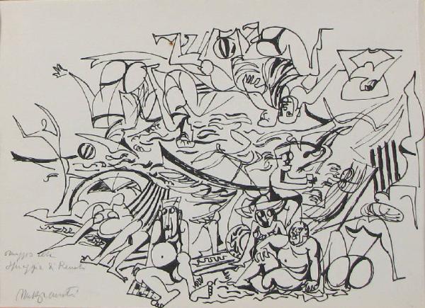 - NOTIZIE STORICO CRITICHE Come si deduce dal titolo segnato sul foglio, questo schizzo a china è un omaggio di Mazzacurati al noto dipinto dell'amico Renato Guttuso intitolato "La spiaggia" (1955-'56).\nIl disegno dunque è stato con ogni probabilità eseguito in un'epoca di poco successiva alla realizzazione de "La spiaggia" da parte di Guttuso. \nAnche Mazzacurati però esegue, all'incirca nello stesso anno, un lavoro sul medesimo soggetto: un bassorilievo quasi identico al disegno della collezione Lajolo (De Luca/ Mazzarella, 1995). \nLa china potrebbe dunque essere stata nello stesso tempo omaggio al dipinto di Guttuso e studio preparatorio per la propria opera scultorea.\nI fenomeni di massa della nascente società dei consumi costituiscono un tema che interessa Mazzacurati: lo dimostrano il dipinto intitolato "Piper" (1964-'67) e i numerosi disegni con questo soggetto da lui eseguiti negli anni '60 che raffigurano i giovani che ballano nella famosa discoteca di Viareggio (Omaggio Mazzacurati, 1971), lavori che ricordano tra l'altro un altro dipinto di Guttuso realizzato nel decennio precedente, "Boogie woogie" (1953).\nGià da prima della guerra Mazzacurati si era fatto conoscere come attento osservatore del costume italico, sia, a livello verbale, attraverso l'invenzione di motti satirici poi divenuti celebri, sia, nel campo artistico, attraverso la realizzazione di opere scultoree che ritraevano in forma caricaturale la società fascista ed i suoi protagonisti (la serie degli "Imperatori", del 1942-'43; quella delle "Gerarchie", del 1943-'44).\nLa tipologia dei suoi "Imperatori", che stigmatizzava quella dello stesso duce, si ritrova, nonostante gli anni di storia trascorsi, anche in questo disegno della collezione Lajolo, seduta sulla spiaggia in primo piano accanto ad un personaggio femminile, perfettamente inserita tra le figure che popolano l'Italia postbellica.\nQuanto allo stile del disegno, esso è molto lontano da quello dell'amico Guttuso al quale fa esplicito riferimento: sia la raffigurazione dei personaggi che la costruzione dello spazio sono di tipo astratto-geometrizzante, una delle modalità esecutive cui Mazzacurati, nel suo eclettismo, ricorre.