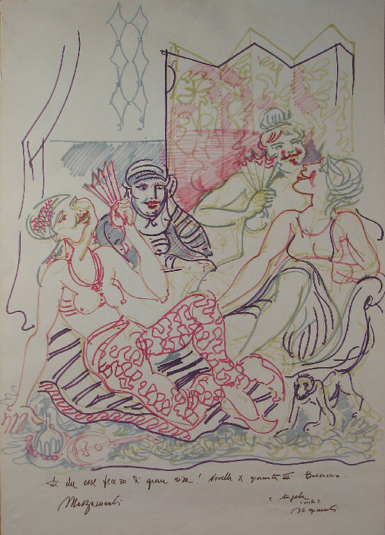 - NOTIZIE STORICO CRITICHE Nel 1966 Mazzacurati partecipa alla mostra "Omaggio a Giovanni Boccaccio degli artisti contemporanei", tenutasi a Certaldo (FI) dove il poeta trecentesco visse e morì (Ruscio R. in De Luca/ Mazzarella, 1995, p. 171).\nE' probabile che l'artista abbia realizzato per tale occasione questo disegno della collezione Lajolo, che raffigura appunto un verso (trascritto nella parte bassa del foglio) di una delle novelle del Decamerone.\nIl disegno inoltre potrebbe essere lo stesso presente anni dopo alla Mostra antologica di Cuneo, presentata da Raffaele De Grada (Mazzacurati Mostra, 1977): non se ne è trovata riproduzione fotografica, ma risulta indicato nell'elenco delle opere in esposizione con il titolo "Illustrazione per il Decamerone" ed è realizzato con la stessa tecnica, quella dei pennarelli. La data riportata è 1962, qualche anno prima rispetto alla mostra dedicata a Boccaccio.\nNel caso l'opera esposta a Cuneo sia la stessa della collezione Lajolo, questa potrebbe essere stata prestata per l'esposizione. Infatti la dedica di Mazzacurati ad Angela Candiani esclude che il disegno possa essere stato acquisito dopo la mostra del 1977, essendo l'artista morto nel 1969. \nIl lavoro sul poeta trecentesco non rappresenta il primo caso in cui Mazzacurati lavora su un tema letterario: già all'inizio degli anni trenta si era impegnato nell'illustrazione dei "Canti Orfici" di Dino Campana.\nIl verso di Boccaccio qui scelto dall'artista gli consente di raffigurare la scena in maniera molto simile a quelle realizzate intorno al soggetto dell'harem, che hanno a loro volta un importante modello pittorico nella "Morte di Sardanapalo" di Delacroix, se pur ispirate da un soggiorno a Beyrouth dovuto all'incarico di realizzare il Monumento ai Martiri Libanesi del 1958 (De Luca/ Mazzarella, 1995, pp.131-132). \nIn particolare, la figura femminile semisdraiata in primo piano sulla sinistra, che indossa dei pantaloni in stile arabo, è molto simile a quella che si trova nella tempera "Ricordo di Beyrouth", del 1957-'58 (De Luca/ Mazzarella, 1995, figg. 83-84).