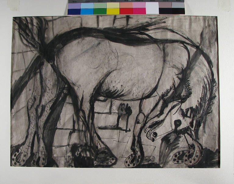 - NOTIZIE STORICO CRITICHE Angela Candiani racconta che il disegno le venne regalato da una dirigente della SIP amica di sua madre. Cassinari, nei primi anni del secondo dopoguerra, aveva chiesto alla donna il favore di ottenere un apparecchio telefonico in casa e l'aveva poi ringraziata regalandole un suo lavoro. La dirigente, che non aveva saputo apprezzare realmente il dono, lo cedette a sua volta ad Angela quando, negli anni '60, dopo averla invitata a cena, la vide arrivare con sotto il braccio il cartiglio di un altro cavallo, disegnato da Aligi Sassu, anch'esso entrato poi a far parte della collezione (Angela Candiani 2000, comunicazione orale). \nIn base alla testimonianza della Candiani, la realizzazione del disegno si collocherebbe dunque all'incirca tra il 1945 e il 1947.\nQuesta datazione sembra coincidere con le caratteristiche dell'opera. Sono infatti ravvisabili gli elementi indicati da Giovanni Anzani come propri del periodo compreso tra i primi anni '40 e il soggiorno a Parigi del 1947 (Cassinari 1998, pp. 12-16): l'eco del Picasso di "Guernica" e della "Minortauromachia", trasferito da Cassinari in una pittura dall'espressività neoromantica vicina nei temi all'esistenza quotidiana; l'influenza dell'opera sculturea di Marino Marini e di quella del Modigliani delle Cariatidi, qui visibile nella linea fluente e nella corposità delle forme. \nI cavalli che l'artista disegnerà più tardi sono infatti esili e leggeri, realizzati con tratto sottile e con una maggiore stilizzazione. \nIl soggetto del cavallo, animale amato da Cassinari e da lui considerato "la forma più perfetta del creato", è molto frequente nella grafica. In particolare, è al centro di una serie di studi cui l'artista si dedica nel 1945, in relazione all'acquaforte intitolata "La guerra" (1945), e, poco più tardi, nel 1947, durante un soggiorno in Maremma. Anche nella successiva attività il soggetto non avrà esiti pittorici ma piuttosto - a partire dagli anni '60, periodo in cui viene ripreso - relativi alla scultura (Cassinari 1986).\nSi fa infine notare che questo disegno della collezione Lajolo presenta alcune caratterische che lo avvicinano alla sopra citata acquaforte "La guerra" (1945), in cui il cavallo appare rovesciato sulla schiena da un carro armato: la posa dell'animale col collo ricurvo verso il ventre è la stessa dell'incisione; inoltre, il fatto che siano visibili tutti e quattro i ferri sotto gli zoccoli (impossibile se il cavallo poggiasse a terra) fa pensare che il foglio potrebbe forse essere guardato capovolto e riferito all'acquaforte in questione.