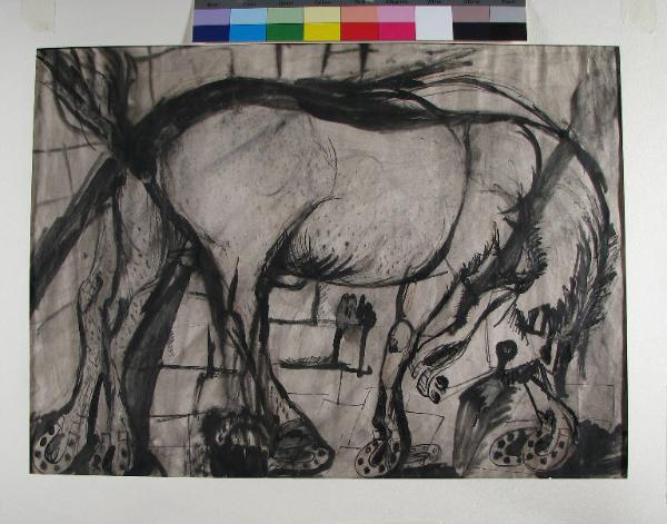 il cavallo sembra ripreso nel chiuso di una stalla; la posa con la testa abbassata e la bocca aperta in un nitrito lo descrivono scalpitante e inquieto.