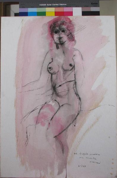 nudo femminile seduto; il colore rosa dell'acquerello è lasciato più denso sui capelli della figura e sulle gambe, a segnare le calze.