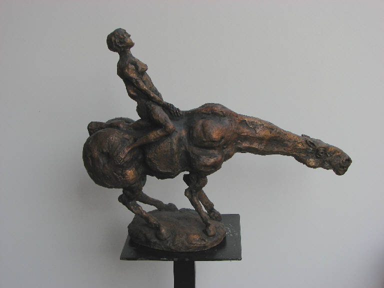 - NOTIZIE STORICO CRITICHE La scultura, non datata, sembra appartenere ad un gruppo di lavori molto simili, in bronzo ma anche in terracotta, realizzati tra il 1970 (Agenore Fabbri 1975) e il 1980 (Agenore Fabbri 1984). \nCome il bronzo della collezione Lajolo, tali sculture rappresentano figure nude di uomini o donne a cavallo; gruppi in cui l'animale fa corpo unico con il suo cavaliere sia dal punto di vista della resa plastica e delle tensioni dinamiche che da quello della dimensione psicologica: i due elementi sembrano infatti pervasi dallo stesso impeto drammatico e allo stesso tempo sensuale, in quella che può essere una rappresentazione di dolore e sofferenza ma anche di estasi carnale (entrambi soggetti assai frequenti nella produzione dell'artista). \nIl classico soggetto del cavaliere a cavallo risulta in tal modo trasfigurato dall'immaginario personale di Fabbri.