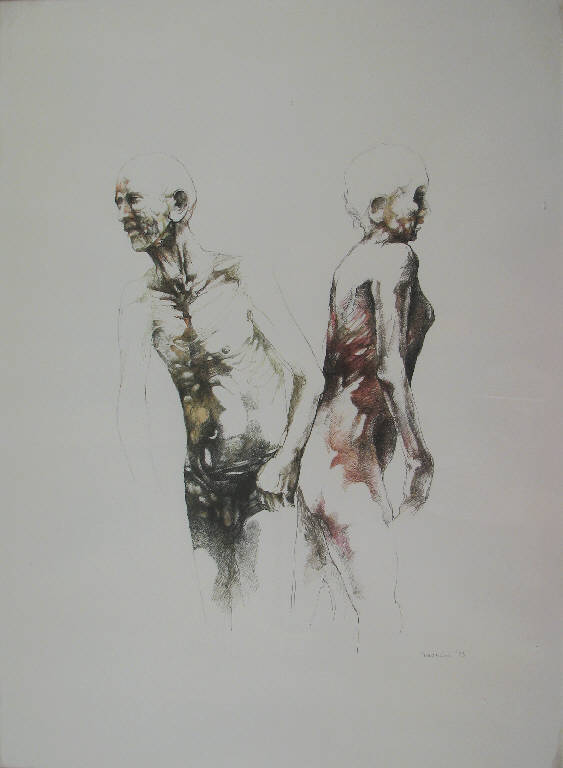 - NOTIZIE STORICO CRITICHE Il disegno appartiene a quella fase della produzione di Timoncini che si colloca negli anni dal 1970 al 1975, anche definita "tragica".\nDopo gli esordi avvenuti nell'ambito del partecipato clima milanese del Realismo Esistenziale, che vedono Timoncini realizzare opere in cui l'ambientazione e il contesto esterno (periferie cittadine, interni di uffici o abitazioni) hanno un loro peso nella rappresentazione di quelle situazioni ritenute emblematiche del degradato sistema di vita contemporaneo; nei lavori eseguiti nella prima metà degli anni '70, l'accento è posto quasi esclusivamente sulla figura umana, spesso unico elemento presente all'interno di uno spazio vuoto (Dell'Acqua G. A. 1990). \nLa figura si presenta nella nudità del corpo e, in modo particolare nella produzione grafica, viene realizzata con una definizione formale e una scelta cromatica tali da metterne in evidenza ossatura, tendini, fasce muscolari, arrivando ad ottenere risultati simili a quelli delle anatomie mediche, con lo stesso senso di glaciale alienazione che le accompagna. \nIn contrasto con questo stile rappresentativo, i soggetti affrontati in questo periodo sono prevalentemente momenti di vita di coppie in isolamento dal mondo; situazioni di intimità e di tenerezza che risultano in tal modo violate, suscitando un'impressione di estraneamento, di solitudine, di incomunicabilità.\nQuello dell'incomunicabilità in particolare sembra essere il tema di questo disegno della collezione Lajolo, in cui il titolo "La stessa danza" invita a porre attenzione al movimento in direzioni opposte che le due figure stanno compiendo voltandosi le spalle.