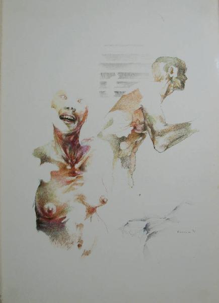 - NOTIZIE STORICO CRITICHE Il disegno appartiene a quella fase della produzione di Timoncini che si colloca negli anni dal 1970 al 1975, anche definita "tragica".\nDopo gli esordi avvenuti nell'ambito del partecipato clima milanese del Realismo Esistenziale, che vedono Timoncini realizzare opere in cui l'ambientazione e il contesto esterno (periferie cittadine, interni di uffici o abitazioni) hanno un loro peso nella rappresentazione di quelle situazioni individuate come emblematiche del degradato sistema di vita contemporaneo; nei lavori eseguiti nella prima metà degli anni '70, l'accento è posto quasi esclusivamente sulla figura umana, spesso unico elemento presente all'interno di uno spazio vuoto (Dell'Acqua G. A. 1990). \nLa figura si presenta nella nudità del corpo e, in modo particolare nella produzione grafica, viene realizzata con una definizione formale e una scelta cromatica tali da metterne in evidenza tendini, fasce muscolari, ossatura, arrivando a ottenere risultati simili a quelli delle anatomie mediche, con lo stesso senso di glaciale alienazione che le accompagna. \nIn contrasto con questo stile rappresentativo, i soggetti affrontati in questo periodo sono prevalentemente momenti di vita di coppie in isolamento dal mondo; situazioni di intimità e di tenerezza che risultano in tal modo quasi violate, suscitando un'impressione di estraneamento, di solitudine, di incomunicabilità.