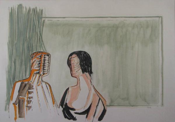 due busti, uno maschile e uno femminile, rivolti uno verso l'altro; entrambi sono raffigurati come manichini senza volto con la differenza che il personaggio femminile conserva caratteristiche più realistiche rispetto a quello maschile, totalmente trasfigurato; la coppia occupa la parte sinistra del foglio dove, sullo sfondo della figura maschile, compaiono lunghi fili d'erba; la parte restante dello sfondo è coperta con una leggera velatura di colore verde