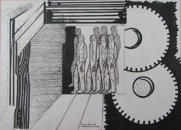 sorta di proscenio con al centro un riquadro in cui compare un gruppo di figure maschili, raffigurate come manichini, ordinato in due file; a destra, due gigantesche rotelle di un ingranaggio