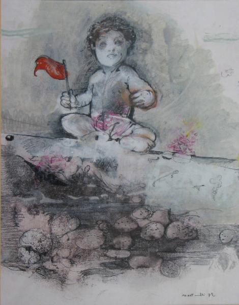 bambino seduto a terra (parte alta del foglio) sulla riva del mare (raffigurato con acqua e ciottoli nella parta bassa del foglio); nella mano destra regge una bandierina rossa